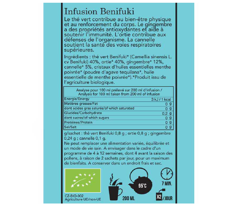 Un infuso a base di tè verde Benifuki dalle proprietà incredibili! Popolare per le sue doti anti congestionanti, contiene ortica, per le difese dell'organismo, cannella, per la salute delle vie respiratorie superiori e menta piperita decongestionante! In più è ricca di EGCG'3-Me, una preziosa sostanza riconosciuta in Giappone perché combatte le allergie stagionali. Confezione: 18 bustine.