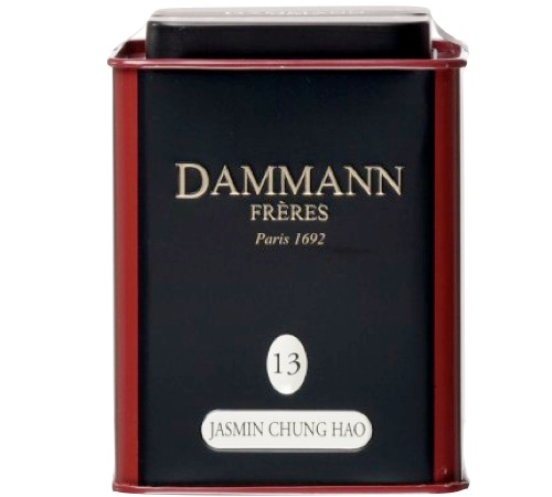 Una scatola di metallo originale di Chez Dammann Frères. La lattina n. 13 contiene 100 g di tè verde al gelsomino.
