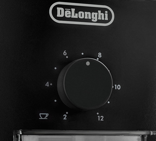 Il macinacaffè elettrico DeLonghi KG79 ha un timer regolabile per l'erogazione del macinatura. L'ingegnoso timer sulla parte anteriore può essere impostato tramite una rotella in base al numero di tazze (da 2 a 12).