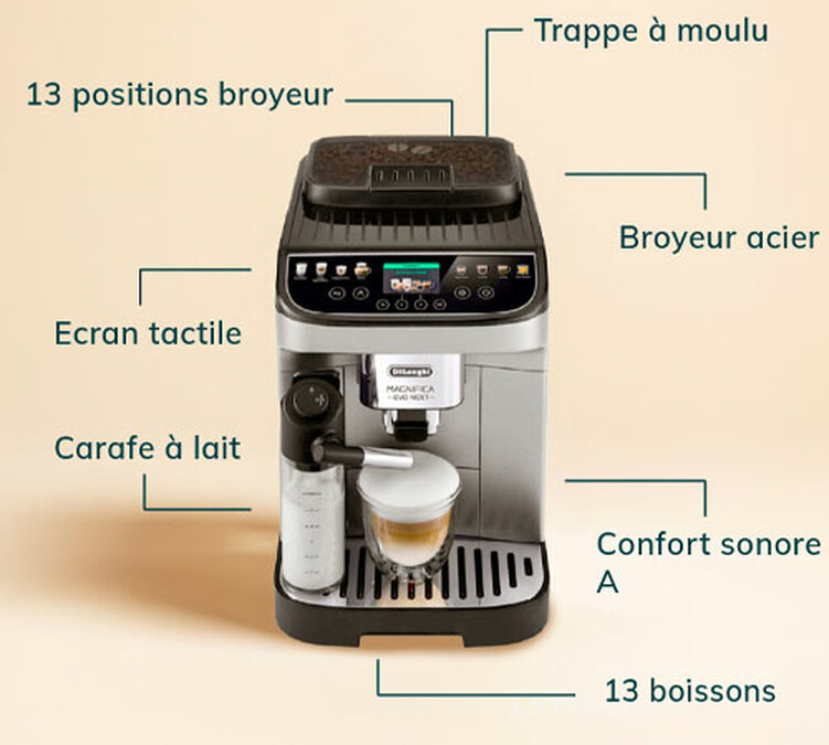 Il modello Magnifica EVO Next ECAM 310.80.SB offre 13 bevande: Espresso, 2 Espressi in contemporanea, Espresso Doppio +, Cappuccino, Cappuccino +, Cappucino Mix, Latte Macchiato, Espresso Macchiato, Caffè, Lungo, Americano e Latte caldo.