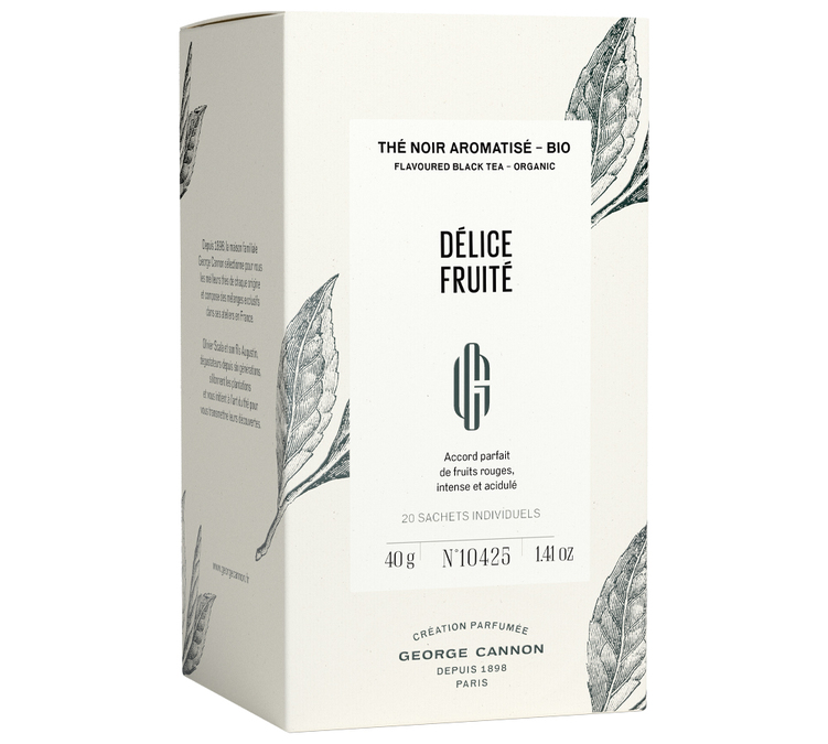 Una delicata creazione di George Cannon, Délice Fruité. Una bevanda dalle note di frutti rossi. Una miscela di tè neri di origini diverse (Keemun, Yunnan) che offre una base ricca ed equilibrata. Note di legno e frutta in una bella tazza rossa. Confezione: 20 bustine.