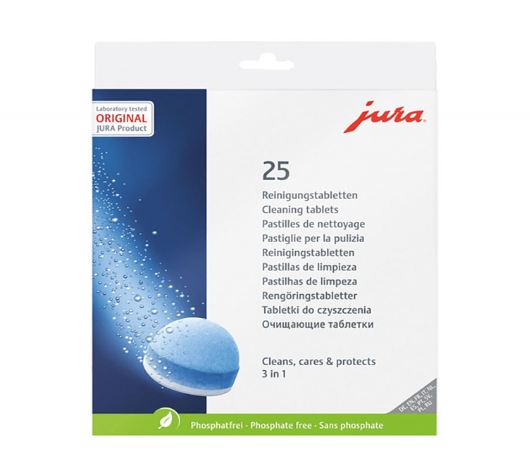 Le 25 compresse detergenti JURA svolgono u'nazione 3 in 1 e assicurano una pulizia e un'igiene che prolungheranno la durata della tua macchina e ti daranno una tazza perfetta.