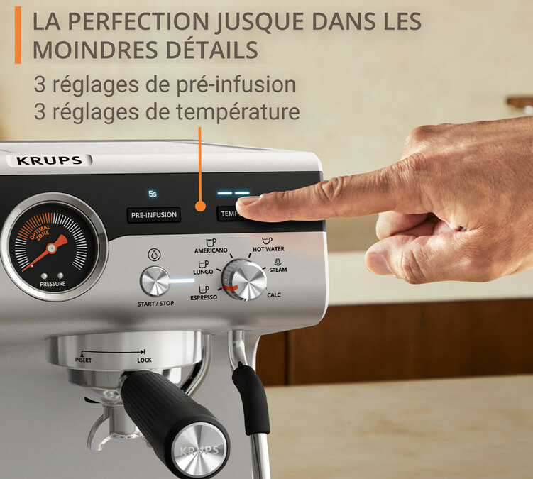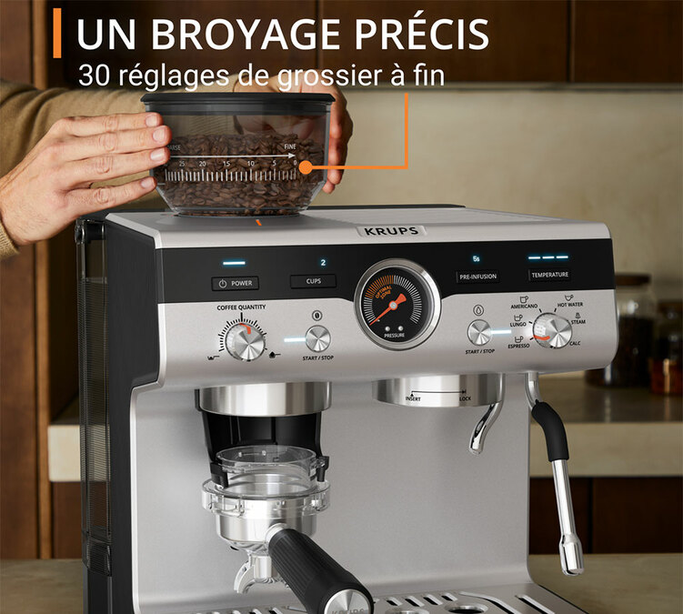 L'interfaccia della Krups Precision + è facile da usare. Puoi scegliere la quantità di macinatura che preferisci e scegliere tra un'estrazione da 1 o 2 tazze. Il manometro sul pannello frontale della macchina da caffè ti permette di controllare meglio l'estrazione e migliorare la tua esperienza di caffè.