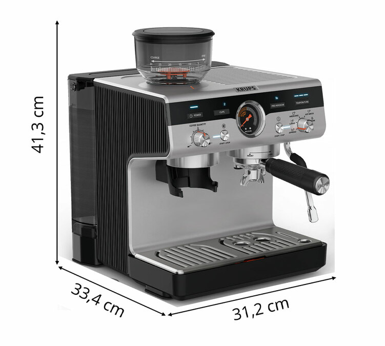 Il sistema Thermoblock di Krups permette un riscaldamento veloce, garantendo un'estrazione perfetta in meno di un minuto. Per quanto riguarda i componenti, la macchina ha un serbatoio dell'acqua da 3,5 litri e una tramoggia rimovibile che può contenere fino a 250 g di caffè in grani.