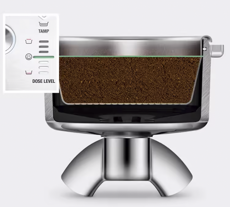 Il nuovo sistema Impress Puck di SAGE è una piccola rivoluzione. Semplifica le fasi di macinazione, dosaggio e rincalzo per erogare la dose perfetta. Inserisci il portafiltro nell'apposito spazio sotto il macinacaffè per iniziare a macinare il caffè. La dose viene calcolata automaticamente in base all'ultimo caffè estratto. Il macinacaffè distribuisce il caffè macinato in modo uniforme nel filtro.