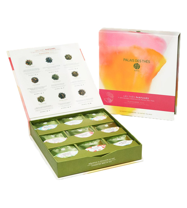 Un cofanetto con 9 tè aromatizzati di Palais des Thés. Una scatola con 45 bustine di tè in mussola. Ce n'è per tutti i gusti, con una varietà di fragranze inebrianti!