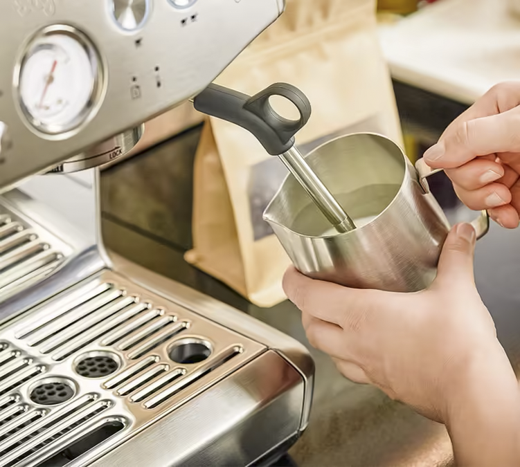 La macchina è dotata di un potente erogatore di vapore in acciaio inox che ruota di 360° C per trovare la posizione ideale. Il vapore viene erogato a 130°C, creando una micro-schiuma perfetta per il cappuccino. Con SAGE Barista Express Impress viene fornita una lattiera in acciaio inossidabile per esercitarsi nella Latte Art.
