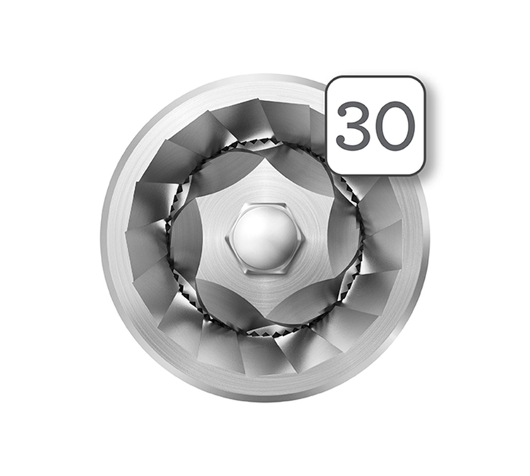 Il macinacaffè integrato è dotato di macine coniche in acciaio inossidabile di alta qualità, che offrono ben 30 diverse impostazioni per ottenere la macinatura ideale, perfettamente adatta al caffè in grani scelto. La tramoggia può contenere fino a 340 g di caffè in grani.