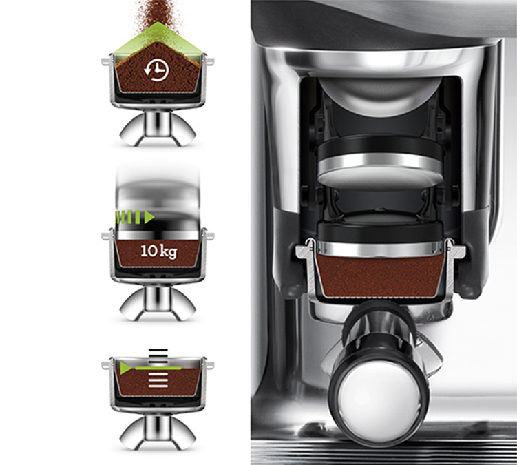 La SAGE Barista Touch Impress non si limita a pressare il caffè. Infatti, il sistema Impress Puck copia il gesto del barista con una pressione di 10 kg e una torsione professionale di 7° sul disco di caffè macinato.