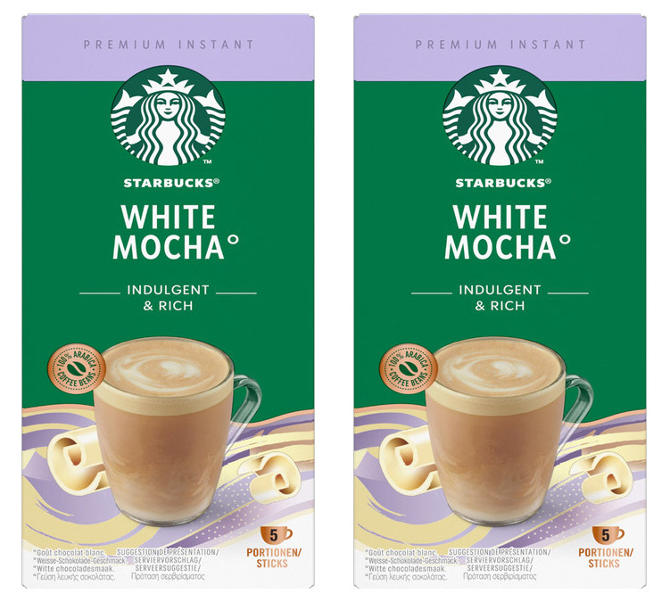 Doppia confezione di caffè solubile White Mocha, prodotto con caffè 100% arabica. Un caffè dal gusto originale al cioccolato bianco da preparare velocemente a casa o in ufficio. Comodo formato in bustine modose per gustare una bevanda Starbucks comodamente da casa. Confezione: 2 scatole da 5 bustine.