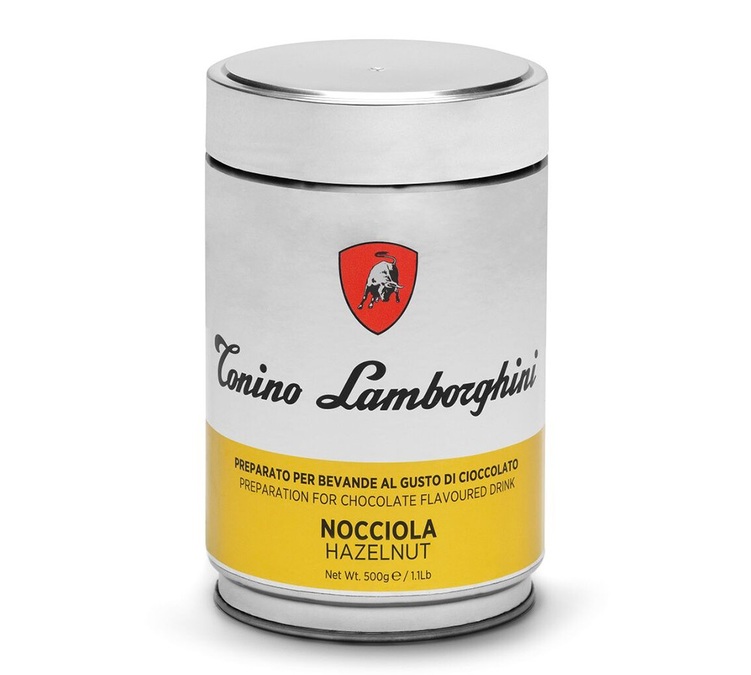 Un barattolo di metallo contenente 500 g di cacao in polvere aromatizzato con nocciola firmato da Tonino Lamborghini. Una ricetta tradizionale con il meglio del cacao e la dolcezza della nocciola.