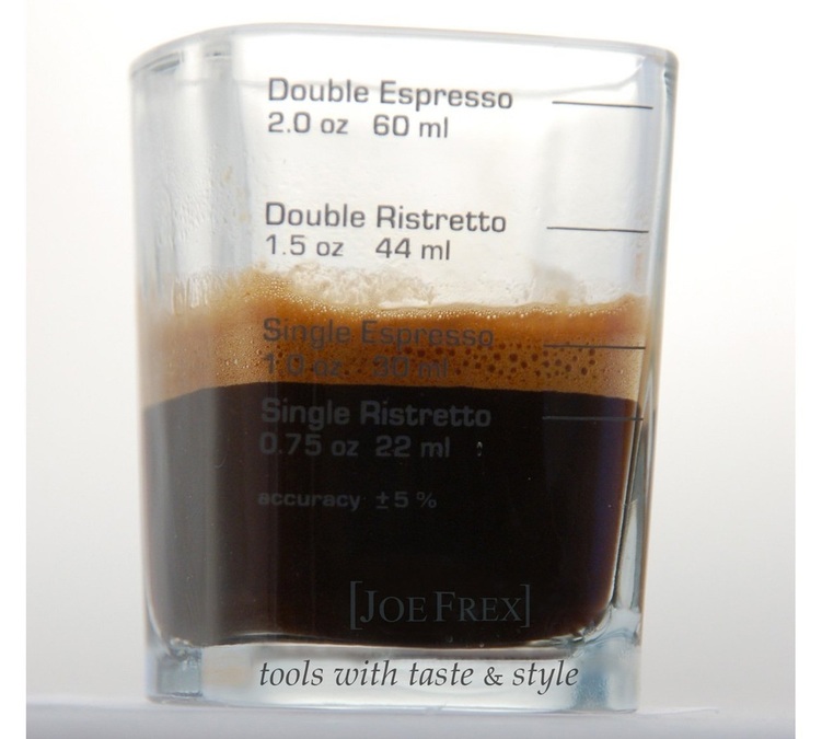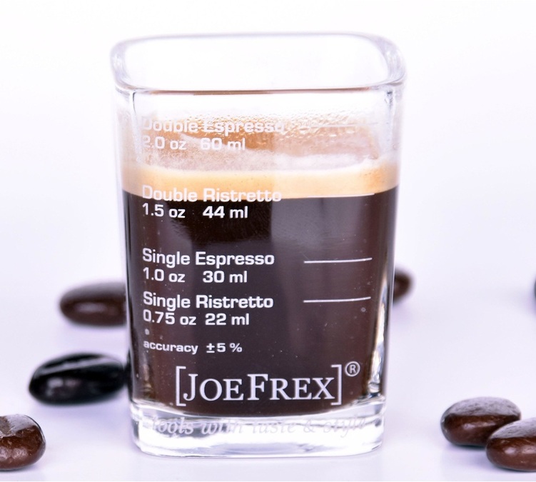Un bicchiere dosatore da 20ml a 60ml del marchio Joe Frex. Le permette di calibrare la quantità desiderata di espresso.
