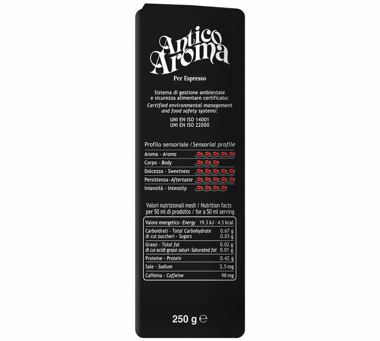 Presentato in una confezione da 250 g, questo caffè è disponibile anche nel formato 1 kg.