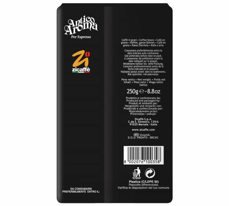 Antico Aroma di Zicaffè è una miscela di caffè in grani lavati arabica e robusta accuratamente selezionati. Un caffè italiano ricco di sapore, con note di fiori, pane tostato e un retrogusto di cioccolato. È il caffè ideale per gli amanti del caffè forte come al bar. Confezione: 250 g.